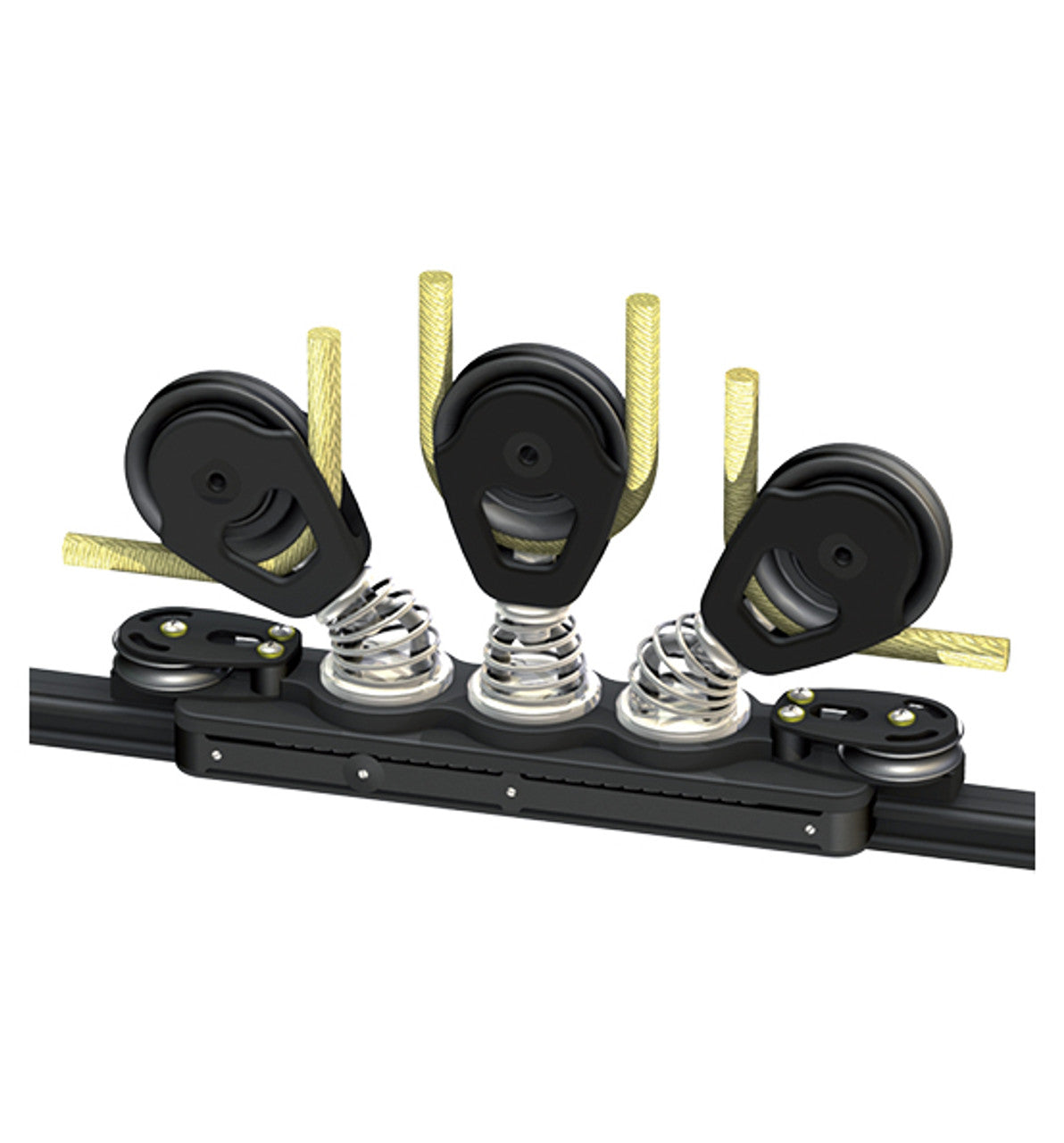 Car with 1 sheave 3 blocks. Ball bearing car in hard black anodized aluminum with four ball circuits: 2 Torlon ball circuits (lower) and 2 Delrin ball circuits (upper). The car will remain on the track even after ball bearing failure (overload). Side windows for easy maintenance and ball bearing cleaning and/or replacement. The car, the track and all components are extruded in high strength alloy and hard black anodized. (Steel parts: AISI 316)