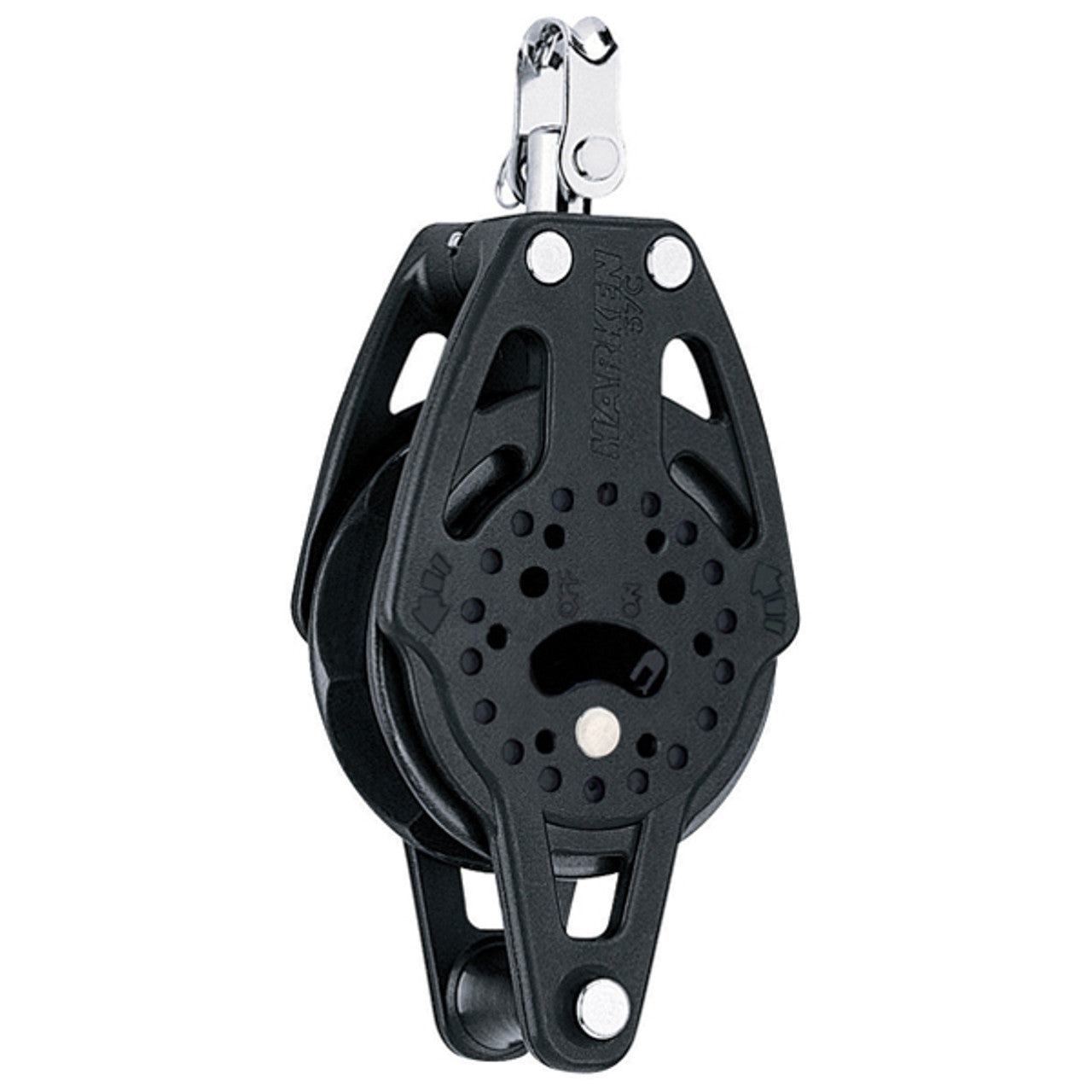 Nylon resin sideplates are densely packed with long-glass fibers for a compact block with a high strength-to-weight ratio. Machined aluminum sheaves are Hardkote anodized for strength and corrosion resistance. Eight facets hold line securely. Ball bearings, sheave, and sideplates are UV-stabilized with carbon black for maximum protection.