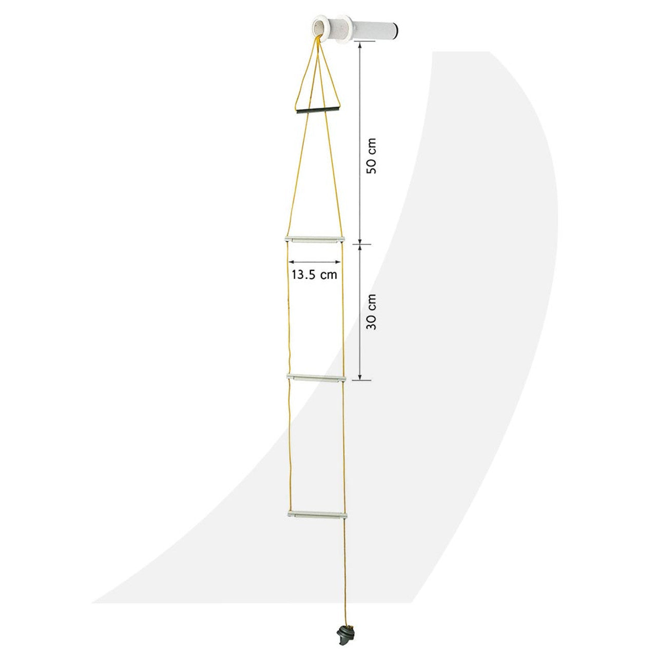Helps any crewmember get back on board easily without external help. Suitable for current use (bathing) or in case of Man Over Board. Consists of 3 polypropylene steps and 1 st. steel handle assembled by a highly resistant line, (bright yellow Ø 3 mm polyester). Ladder is stored in a polyamide tube with a grey polypropylene cap, for optimum protection and waterproofness.