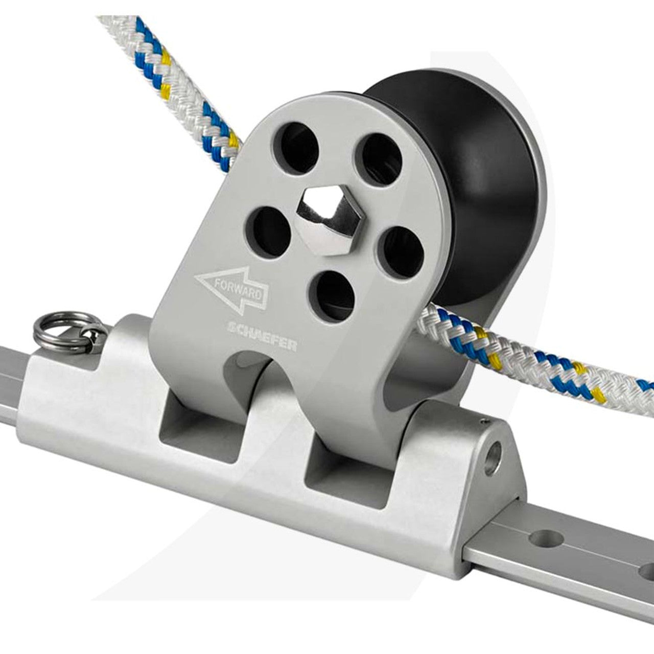The New 32-82 featuring an aluminum sheave runs on the Nomex™/Teflon™ Bearing as well as Delrin™ Ball Bearings for a very strong and smooth lead. In addition, we have added two S.S. springs keeps the block upright when not in use. Maintenance is easy with the removable sheave and machined flushing holes. Double your sheeting flexibility with Schaefer.