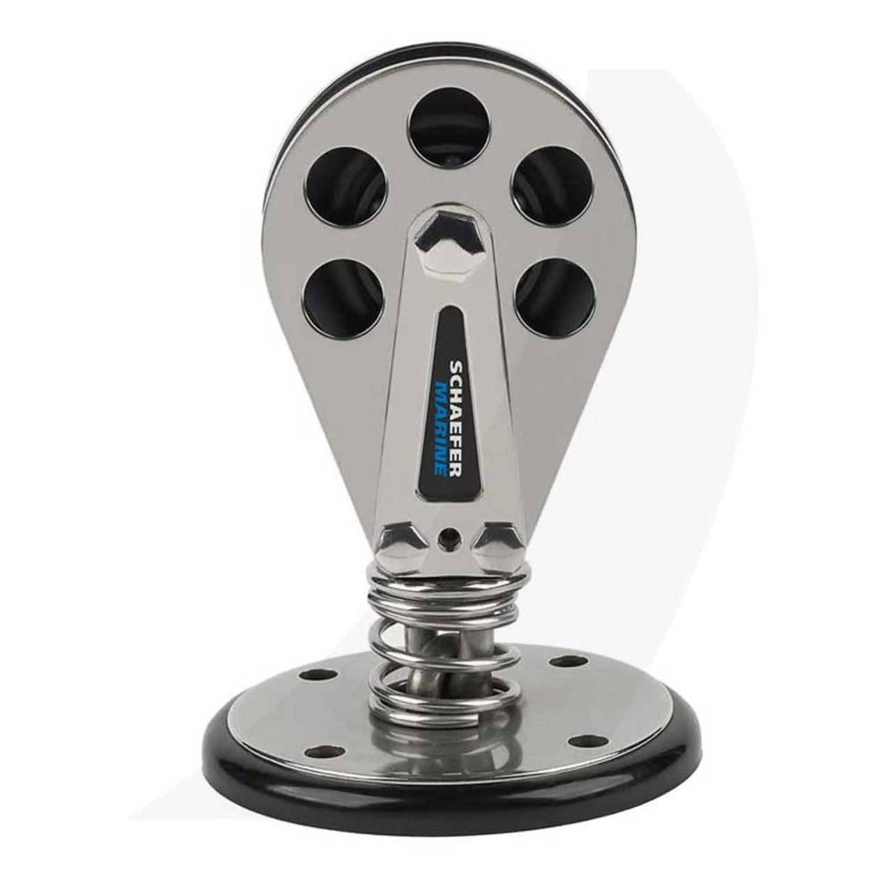 Excellent for fixed position halyard, sheet or control line fairleads. Block swivels 360°, tilts in all directions and is supported by a heavy gauge S.S. sprint to prevent deck contact. Large Ø base helps distribute loads to a larger surface area than other smaller designs.