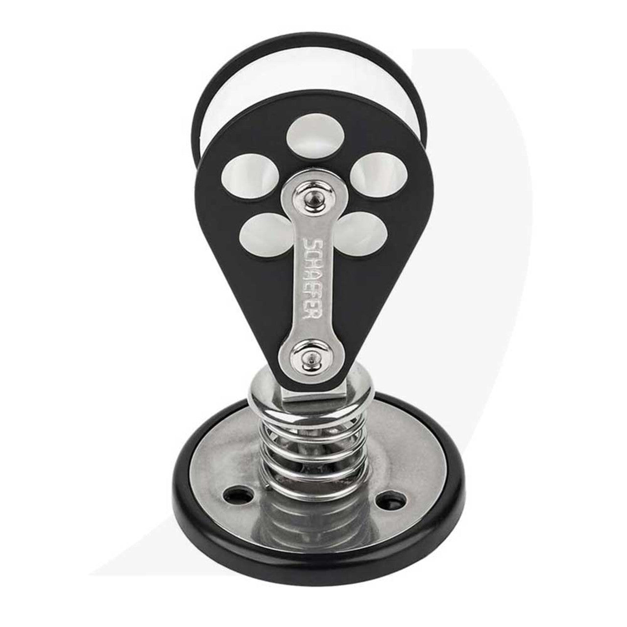 Excellent for fixed position halyard, sheet or control line fairleads. Block swivels 360°, tilts in all directions and is supported by a heavy gauge S.S. sprint to prevent deck contact. Large Ø base helps distribute loads to a larger surface area than other smaller designs.