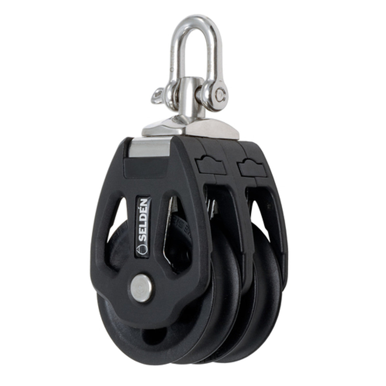 Acetal sheave Stainless steel strap for best strength and longer service life Stiff glass fibre reinforced cheeks to prevent lines from wedging Glass fibre reinforced composite Sliding swivel locking mechanism