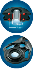 Stage 2 - Under heavy loads, where deformation of ball bearings alone would result in increased friction, a sliding Acetal bearing on a polished stainless steel race takes over, maintaining low friction performance.